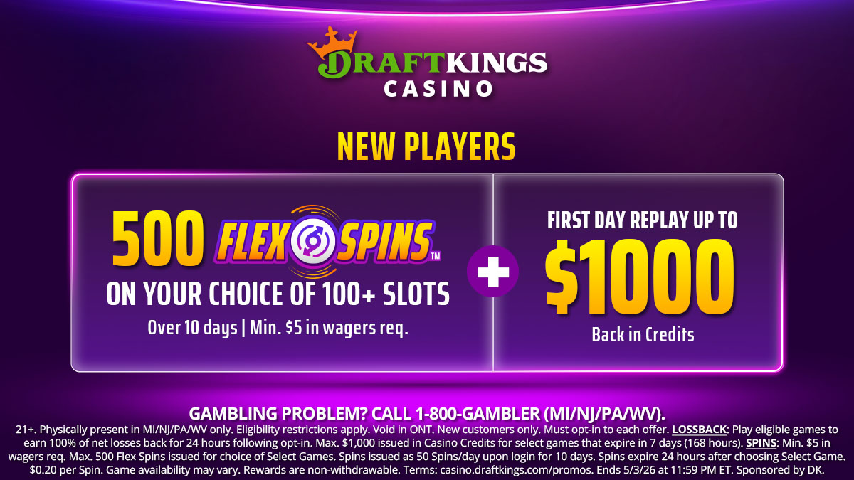 Physically present in CT/MI/NJ/PA/WV only. Void in ONT. Eligibility restrictions apply. New customers only. Must opt-in to each offer. LOSSBACK: Play eligible games to earn 100% of net losses back for 24 hours following opt-in. Max. $1,000 issued in Casino Credits for select games that expire in 7 days (168 hours). SPINS: Min. $5 in wagers req. Max. 500 Casino Spins for featured game. Spins issued as 50 Spins/day upon login for 10 days. Spins expire 24 hours after issuance. $0.20 per Spin. Game availability may vary. Rewards are non-withdrawable. Terms: casino.draftkings.com/promos. Education Hub: dkng.co/HowToPlay. Ends 3/29/26 at 11:59 PM ET. Sponsored by DK.